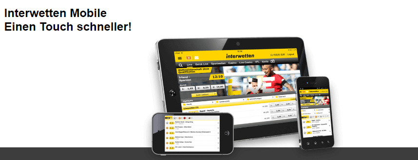 Bei seinen Kunden ist Interwetten durch seine Webseite sehr beliebt. Das mobile Gaming verlangt kein Download, die Webseite kann einfach im Browser geöffnet werden. Zusätzlich gibt es bei Interwetten auch eine App zur Verfügung! Es ist sehr leicht, diese zu benutzen und die passt technisch zu allen gängigen Endgeräten, wie zum Beispiel iOS, Android, Blackberry OS oder Windows. Ferner, nachdem es in 2012 einen technischen Relaunch gab, funktioniert die App auch für die Tablet-Fans problemlos. So kann man bei Interwetten auch mobil das komplette Wettportfolio inklusiv des Live-Centers für Handy Wetten sehen.