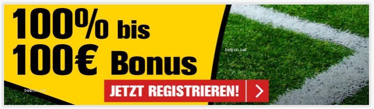 Der Neukundenbonus ist gültig nur wenn die erste Einzahlung innerhalb von 10 Tagen nach der Registrierung getätigt wurde. Innerhalb dieser Frist bekommt man so lange Bonus auf die Einzahlungen, bis die Summe von 100 Euro in Bonus erreicht wurde. Man muss dabei innerhalb von 14 Tagen den verlangten Wetteinsatz machen.
