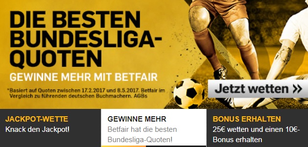 Dank seiner langjährigen Erfahrung, zuverlässiges Verhalten und großes Wettangebot, sichere und effiziente Wettprogram und Strategien, hat sich Betfair auf dem Markt durchgesetzt und Millionen Kunden gewonnen. Zögern Sie sich nicht und seien Sie einer dieser Kunden! Verpassen Sie sich nicht Ihren Chancen für Gewinn bei Betfair. Registrieren Sie sich noch jetzt und holen Sie sich den 100 % betfair Bonus Code!