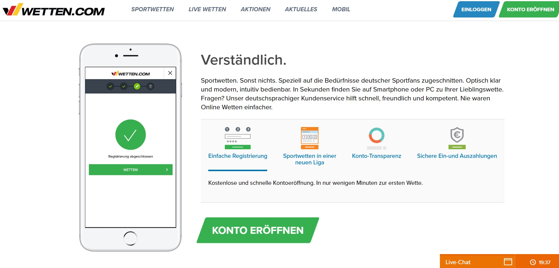 Denn bei der Gestaltung einer Webseite, sind nicht nur die Ansicht und die Farben wichtig, sondern auch die Navigation, die Ladezeiten und seiner ganzen Performance. Alle diese Wichtigen Kriterien hat Wetten.com gut balanciert - die Wettfans können sich sehr schnell dank der unterschiedlichen Schaltflächen und des gut gestalteten Navigationspanels orientieren. Zu langen Ladezeiten, unterschiedliche Fehler und andere sind im Prinzip vielleicht natürlich möglich, solche aber haben wir während unserer Tests nicht erlebt.