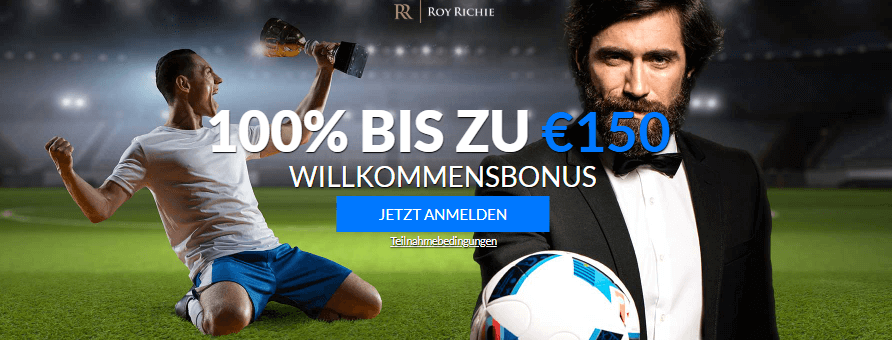 Normalerweise erhalten die Kunden von Roy Richie einen Willkommensbonus bis zu 100 € auf der offiziellen Website des Buchmachers. Diese Kunden, die auch unsere Nutzer sind, werden die Chance haben, 50 € mehr drauf bei der ersten Einzahlung dazu zu gewinnen. Das bedeutet, Sie müssen nur eins tun, den Neukundenbonus von Roy Richie durch unseren Link zu beanspruchen. So angeboten beträgt dieser Neukundenbonus mehr als die meisten ähnlichen Boni auf dem Wettmerkt. Die Teilnahmebedingungen sind auch unterschiedlich und ein bisschen aufwändiger. Sie müssen nämlich den Bonus und Ihre erste Einzahlung acht Mal umsetzen. Die Quote für diese Aktion liegt bei 1,80. Falls Sie auf Kombiwetten einsetzen, dann gilt der Auszahlungsschlüssel von 1,60.