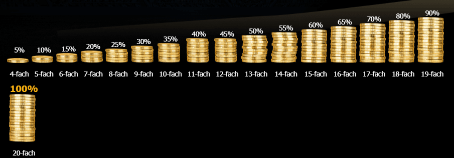 Die Fans von den Kombiwetten sind hier auch geehrt. Bei einer Wette mit drei oder mehr Matches werden Sie einen Prozentsatz auf Ihrem potenziellen Gewinn erhalten. Falls Sie auf acht Einzelwetten einsetzen, dann werden Sie 25 % drauf gewinnen. Der Zuschuss bei 13 Einzelwetten ist 50 % und bei 20 wird Ihr Gewinn von dem Buchmacher verdoppelt. Die Teilnahmebedingungen bestimmen, dass Sie Ihre Wetten auf Soccer, Tennis, Basketball, Eishockey, Baseball und amerikanischen Fußball einsetzen müssen. Es gilt die Quote von 1,20 für jede einzelne Wette und 4,00 oder höher für die gesamte Kombiwette.
