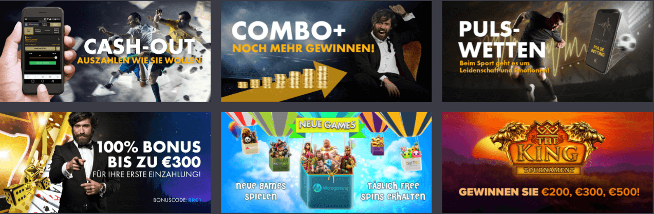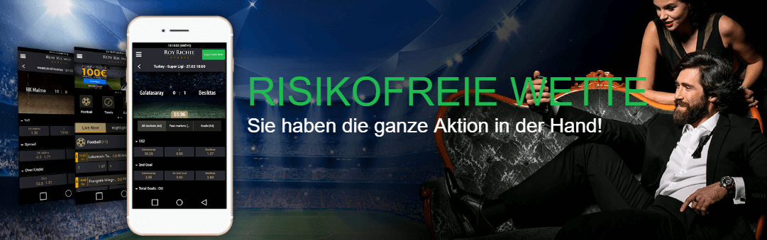 Normalerweise erhalten die Kunden von Roy Richie einen Willkommensbonus bis zu 100 € auf der offiziellen Website des Buchmachers. Diese Kunden, die auch unsere Nutzer sind, werden die Chance haben, 50 € mehr drauf bei der ersten Einzahlung dazu zu gewinnen. Das bedeutet, Sie müssen nur eins tun, den Neukundenbonus von Roy Richie durch unseren Link zu beanspruchen. So angeboten beträgt dieser Neukundenbonus mehr als die meisten ähnlichen Boni auf dem Wettmerkt. Die Teilnahmebedingungen sind auch unterschiedlich und ein bisschen aufwändiger. Sie müssen nämlich den Bonus und Ihre erste Einzahlung acht Mal umsetzen. Die Quote für diese Aktion liegt bei 1,80. Falls Sie auf Kombiwetten einsetzen, dann gilt der Auszahlungsschlüssel von 1,60.