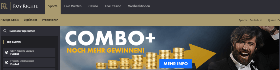 Wir beschließen, dass der Neukundenbonus von Roy Richie besonders attraktiv für die Kunden ist. Wir können Ihnen nur raten, zögern Sie nicht lange, von ihm zu profitieren. Indem Sie diesen Bonus in Teile freispielen, werden Sie die angebotenen Bereiche von dem ganzen Wettangebot testen.