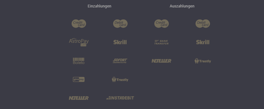 Was die Auszahlungen betrifft, sind die Zahlungsmethoden wie die Kreditkarten (Visa, MasterCard), die elektronischen Wallets Neteller, PayPal, Skrill, Trustly, sowie die Banküberweisung zugelassen. Die mit den Wallets überwiesenen Beträge werden bis zu 24 Stunden in Ihrem Konto gutgeschrieben. Die durchschnittliche Dauer einer Transaktion ist ungefähr 4 – 5 Stunden. Die Auszahlungen mit den Karten dauern bis zu drei Werktagen und die Banküberweisungen – bis zu fünf Werktagen maximum.