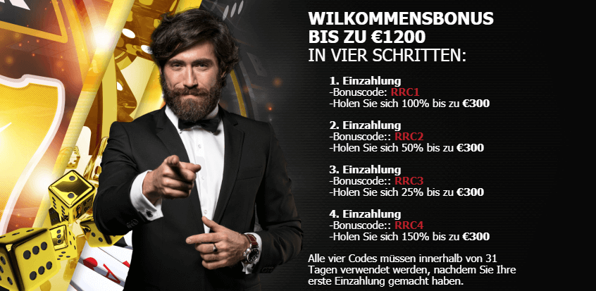 Roy Richie weiß ganz genau, wie er Ihre Aufmerksamkeit gewinnen könnte. Im Casino belohnt er seine Kunden mit einem verlockenden Bonus bis zu 1200 €. Dieser Bonus ist in vier Stufen verteilt, so dass jeder Spieler allein einschätzen kann, wie viel er einzahlen will. Von Ihrer ersten Einzahlung hängt natürlich ab, wie hoch Ihr Bonus sein wird. Weiter unten können Sie nachvollziehen, wie genau das Freispielen des Bonus läuft. Die Umsatzanforderungen lauten, dass Sie den Bonus und Ihre erste Einzahlung 35 Mal umsetzen müssen, bevor Sie eine Auszahlung vornehmen dürfen. Es ist wichtig zu beachten, dass der Buchmacher Ihnen einen Zeitraum von 31 Tagen nach Ihrer ersten Einzahlung in dem Casino zur Verfügung stellt, um den Bonus zu nutzen.